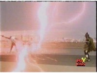 Memorase's cape whips through the Rangers, spark bursting them until they fall. |