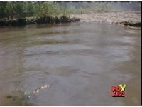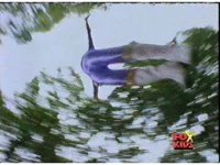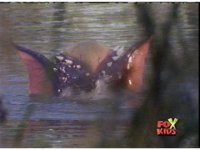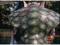 Aquafiend pokes his head above the water, then makes his way ashore, shaking his arms and shelled back, then talking. |