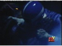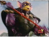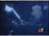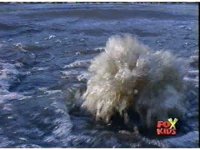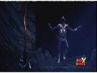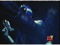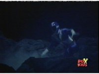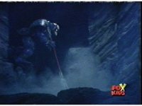 Aquafiend kicks Blue away, then fires on him, but misses. Blue fires his Thermo Blaster, wrapping a rope-beam around the Demon and using it to grab the trident, launch himself off Aquafiend with a kick, and leap to the surface. |