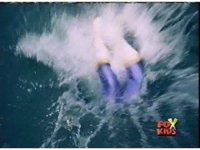 Blue dives into the water, his teammates watching. |