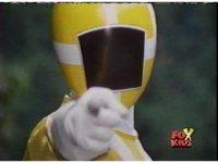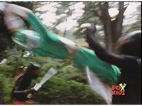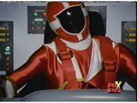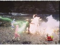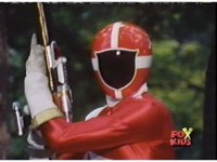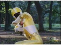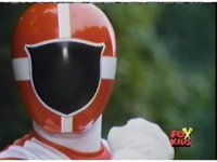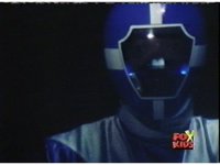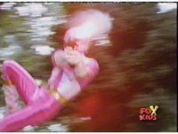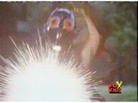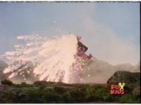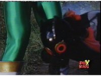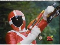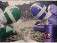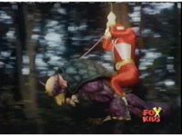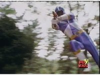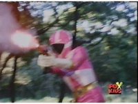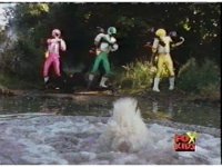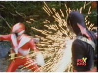 Aquafiend rushes at the downed Rangers, but Red leaps in and fires sparkily on him with both Blasters. |