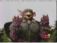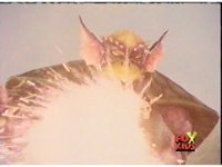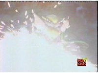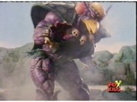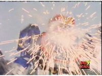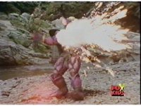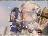 The Rangers prepare their Thermo Blasters in Booster Mode, and on Red's command, fire them at Aquafiend, who explodes, leaving behind only debris. |