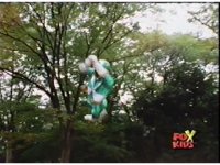 Green does a human corkscrew maneuver through the Batlings. |