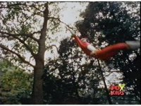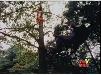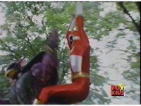 Red swings in on a rope, grabs Aquafiend, and slams him into a tree, then releases him to drop, before leaping down and rejoining his team, Blue then readying his Thermo Blaster. |