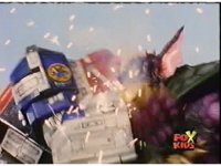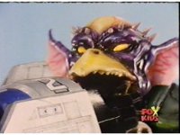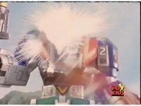 Omega Megazord shoves the trident aside, grabs Aquafiend by the neck, and sparkily headbutts him twice, before kicking his feet out from under him, knocking him down for but a moment. |