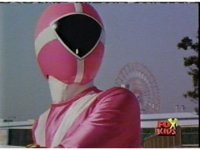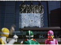 Arachnor teleports away before the Unilaser beam can strike her, exploding harmlessly. The Rangers react, rushing over to find no trace of her, Green talking, then Pink, who points out the giant web is gone. Red finally pats on her on the back. |