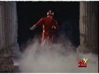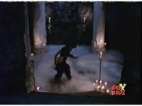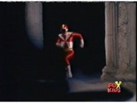 Red talks and holds his Baton forth, Queen Bansheera opens her curtains, talks, then Red rushes forth, she releases a spray from her hand, sending him flying into a pillar. |