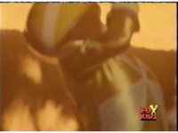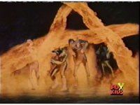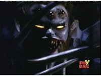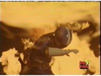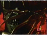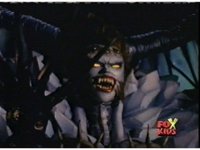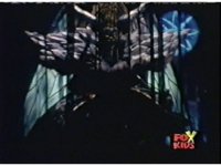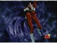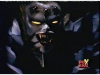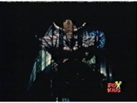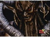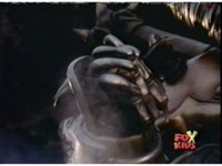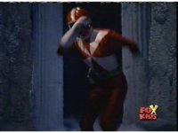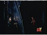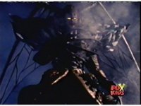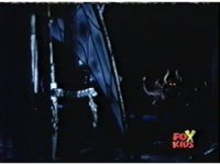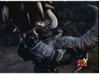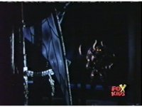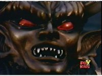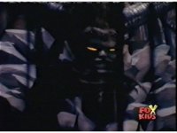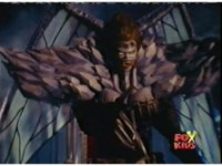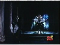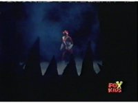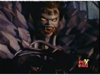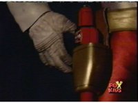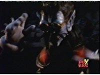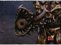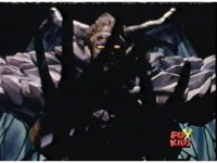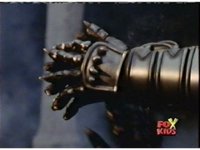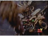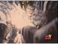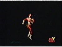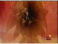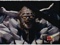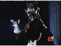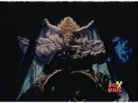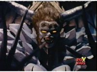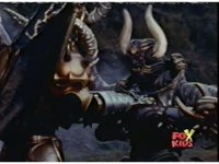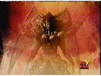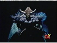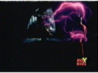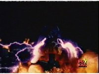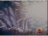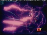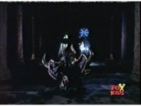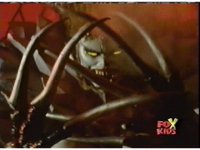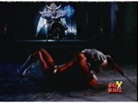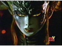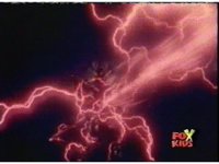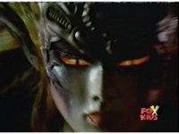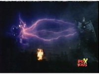 Queen Bansheera talks and gestures hand, Red remains on the ground, but begins to recover, she gets up and steps forth, then reaching forth, firing electricity from her hand, snagging Red and dragging him into the air and spark bursting him. She talks and gestures her other hand, while Red responds, remaining in the air. |