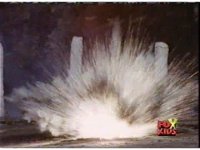 Building spark bursts and is sliced completely in half explosively. |
