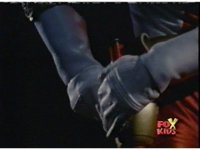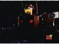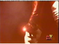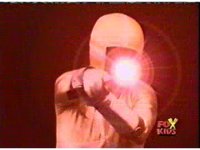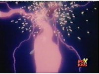 Red nod-talks and remains suspended by the electricity, Bansheera talking, then Red pulls out his Blaster and fires sparkily upon her, releasing him. |