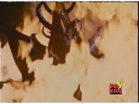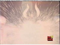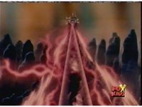 Sharp zoom out from Queen Bansheera three times, as a beam of energy strikes down from Skull Cavern, hitting Diabolico and exploding him massively. |