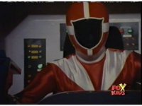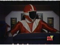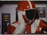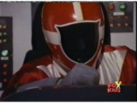Red, leaning forth, talks, then readies thumb and presses button, causing Lightspeed Megazord's eyes to glow, as it runs a search of the area. |