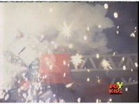 As a severed office building erupts into a series of explosions upon an overpass, the burned-out shell of an automobile is visibly flung about in the debris. |