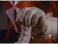 Queen Bansheera talks, Red recovers and talks, then she reacts, as he readies his Battle Boostered fist, leaps forth, shrugs off her electricity blast, and sparkily punches her in the gut. |