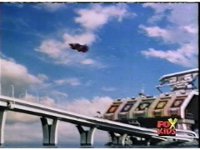 Red Mobile Armored Vehicle shoots into the air from the top of the Train Bay. |