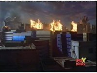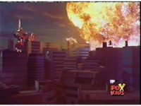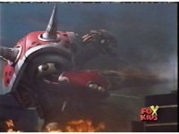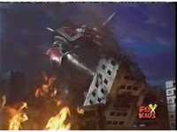 Jetara fires on Time Force Megazord Mode Red, exploding the city between them, smoke covering the scene until Mode Red steps out from within it unharmed. |