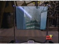 Beam strikes green cardboard building, shattering it sparkily. |