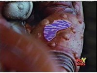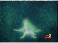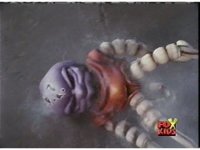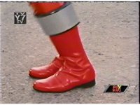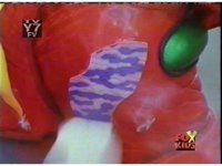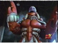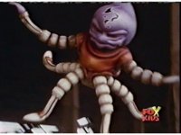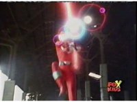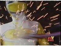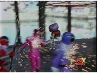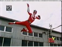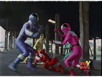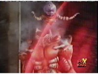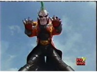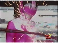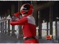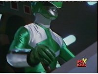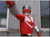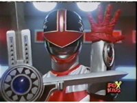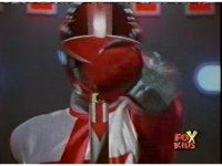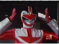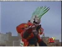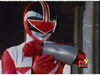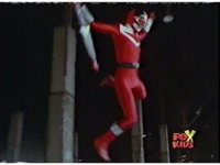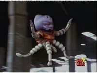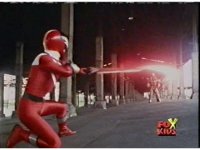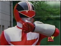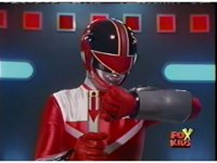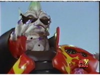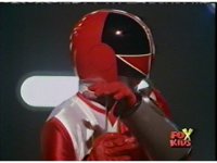 Red stands up, nod-talks, then leaps up and energy slashes his Chrono-Sabers at Tentaclaw, whose head detaches from his body to avoid getting sliced! Red reacts, as the little Mutant flies forth, sparkily slashing past him, knocking Red down, before doing the same to the other Rangers. |