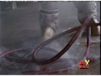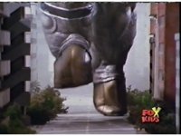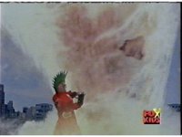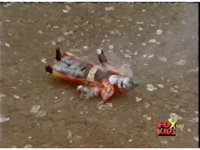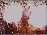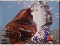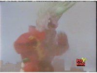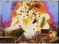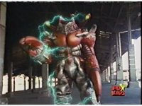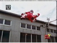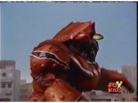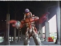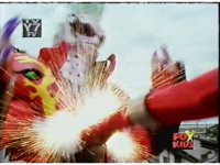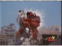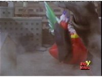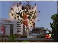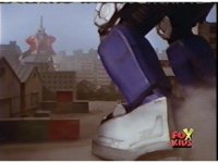 Punky is thrown into backflipping away from Mode Blue, smashing a building to pieces as he does, until he falls. |