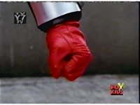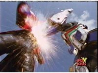 Mode Blue lands before Punky, who rushes at it, prompting the Megazord to begin to sparkily punch rapidly into the Mutant's chest, Red in the cockpit punching in the air. |
