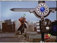 Mode Red's Saber drops its side blades, causing a green clockface to appear. |