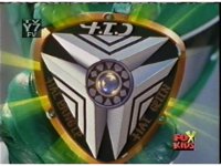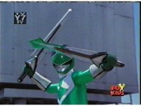 Red raises his Saber straight up, dropping the side blades, which the Megazord also does, causing a green clockface to appear. |