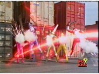 The Rangers regroup around Green as Rabbitcon laser lashes all five of them, spark bursting them down. |