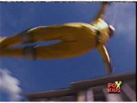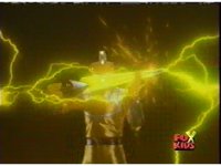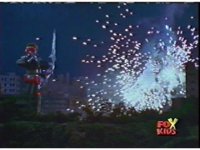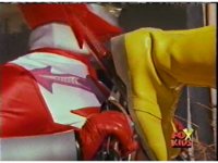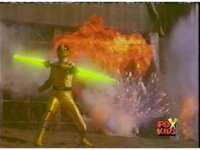 Medicon staggers back, smoking. Yellow leaps up, flips over Red, then bounces off of his crossed Sabers. |