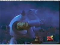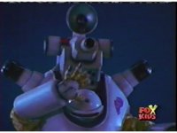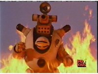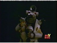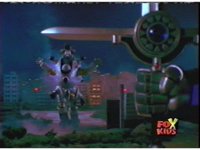 Rabbitcon nervously motions arms, then summons some Cyclobots, Green leads the team in whipping out Chrono-Sabers and sparkily slashing the Cyclobots. |