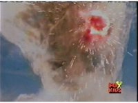 The portal opening on top of a stadium dome, the five Time Flyers shoot out of the vortex and into the present. |