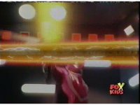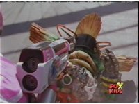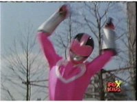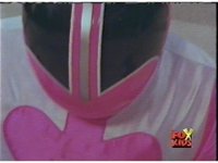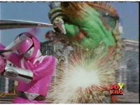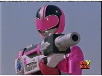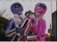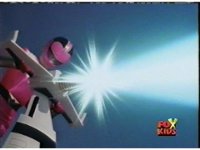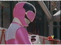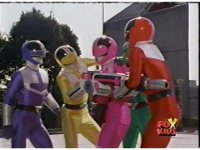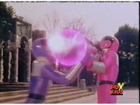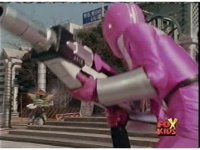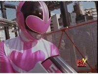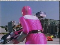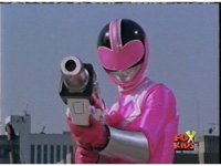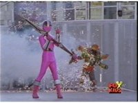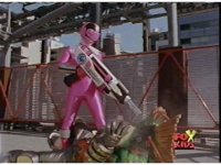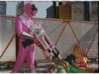 Pink lands with her V5 aimed at Fatcatfish, he reacts, she talks, so he reluctantly turns around, arms raised, she lowers her guard, and he quickly turns and fires upon the Rangers, spark bursting them down. |