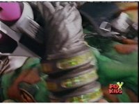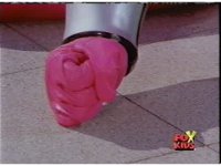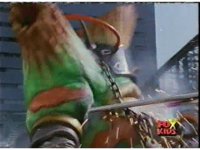 Pink readies her Chrono-Sabers, rushes forth, through her teammates, sparkily slashing Fatcatfish, as her teammates regroup, Green & Yellow reacting to each other. |