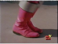 Pink lands, and charges up her Chrono-Sabers, and energy slashes Fatcatfish, causing him to crackle. |
