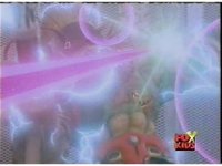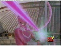 Pink leaps up, readies her Chrono-Sabers, and flings forth a bolt of pink energy, which spark bursts Fatcatfish. |