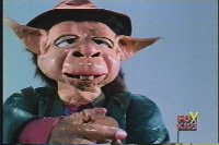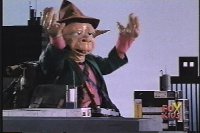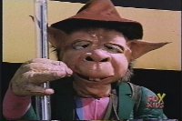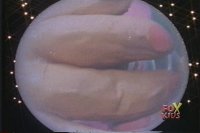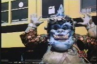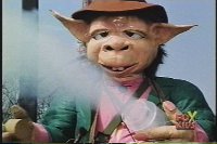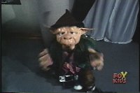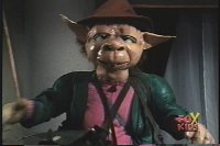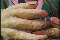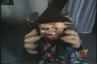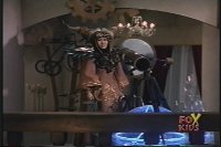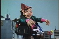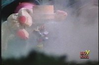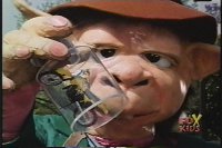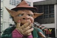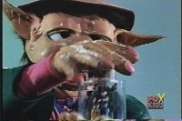 Zoom in over back of Rita and friends, as Ticklesneezer talks, makes ball-like gesture with hands, then bows nervously. |
