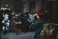 Continued from two shots ago, side angle of Finster, Rita, Baboo and Squatt. Baboo points forth, then turns to Rita. |