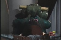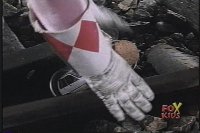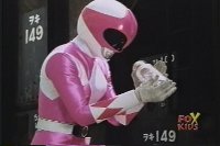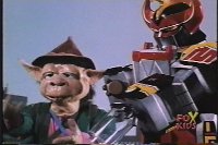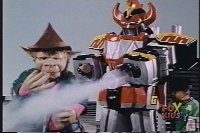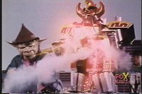 As Ticklesneezer motions hands (and giant Japanese boy hides behind the robot's butt, shh!), zoom in on Megazord's face as it holds sucking bottle downward. |