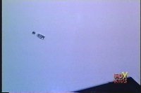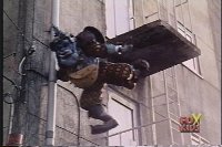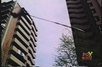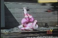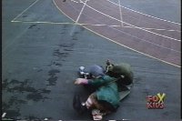 Downward shot of Ticklesneezer landing in a heap on basketball court. |