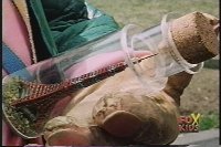Close on Ticklesneezer opening his vacuum-misted bottle. |
