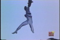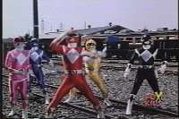 Ground angle of five Rangers looking upward, quick zoom on Red as he leads the leaping way. |