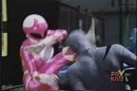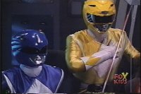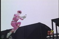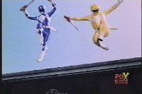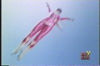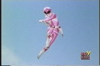 Yellow and Pink Rangers leaps up through the blue sky, Pink way ahead of Yellow. |