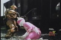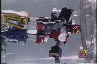 Close up of Ticklesneezer slamming bottled Megazord down. |