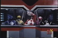 Rangers in Megazord cockpit look to our left, glancing over at Black, who talks, crosses arms, and wags finger. |