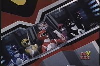 Rangers in cockpit all look down and to our left, Yellow sitting down as Red semi-stands in his seat, slow zoom on him as he gestures fist then grabs control and looks down in front of him. |