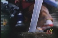 Close up of Power Sword impaling into ground, Ticklesneezer jumps up behind it. |