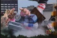 Megazord waves arms in the air as it helplessly slides across city, before dematerializing. |