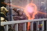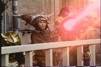As Goldar holds on and Baboo points, Rita goes on the offensive, firing orange beam from Magic Wand. |