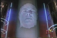 Close up of Zordon talking straight on, kind of talking over us, looking pretty serious. |