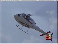 A helicopter flies above the city, Vexicon fires upon it, spark bursting the cameraman and reporter within, causing the now-smoking machine to fly straight into a building, explosively . |