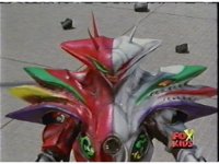 Red goes over to Pink, then angrily leaps forth with his Chrono-Saber, attempts to strike the Mutant but misses, his weapon held and Vexicon's blade placed against him, holding him in place while a gun pops out of the Mutant's chest, firing upon the Ranger sparkily, blasting him down while his teammates regroup around him. |